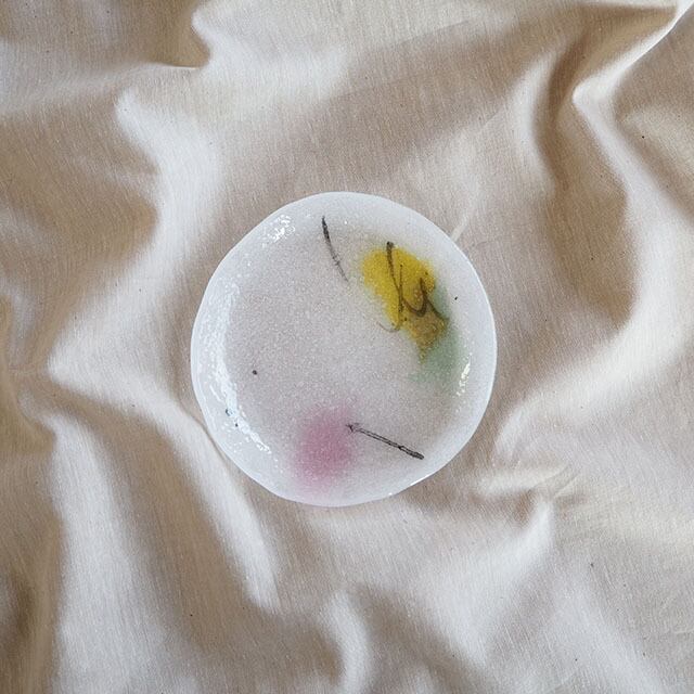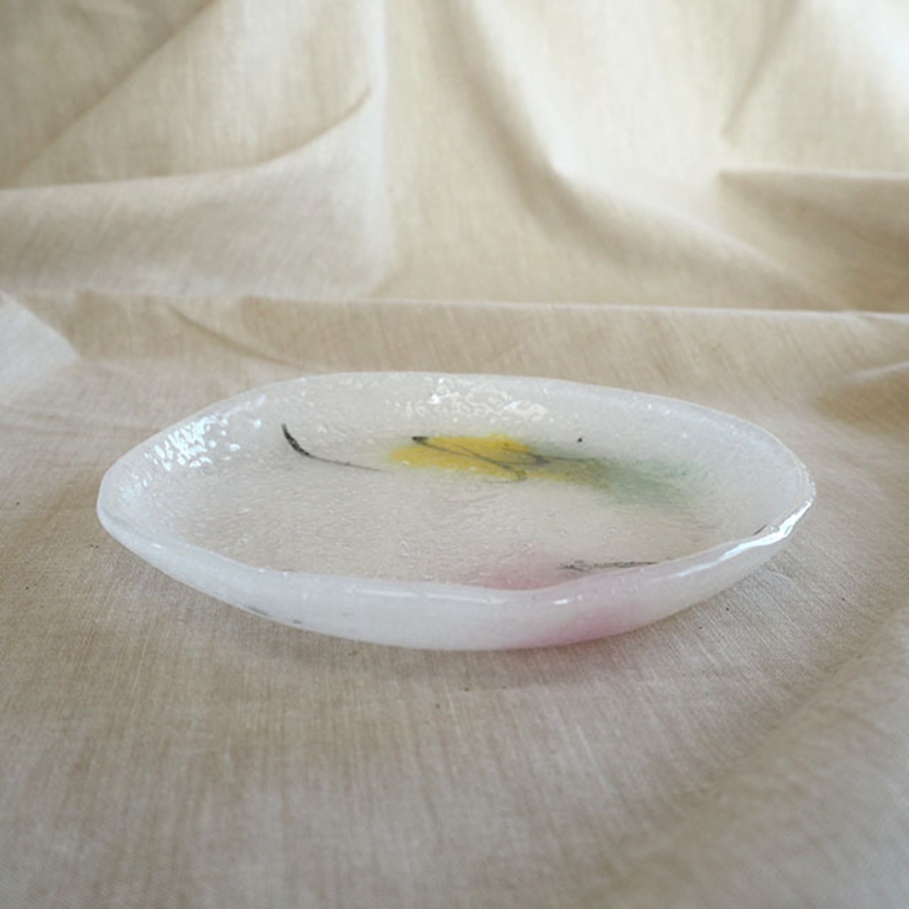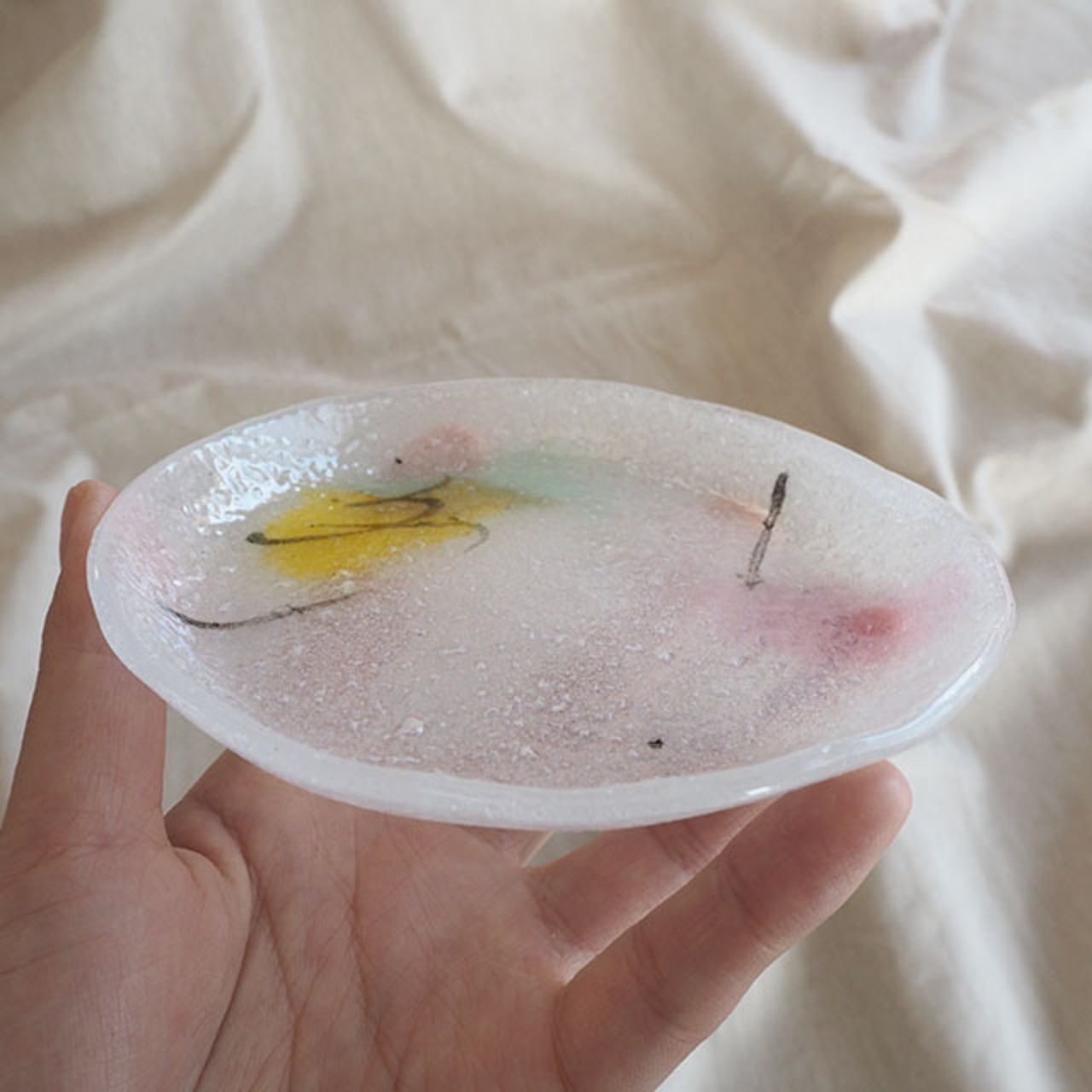 粉のガラスを窯で溶かし合わせて形にするキルンワークという方法で制作しています。ベースとなる薄い板ガラスを作り、色ガラスを調色して彩色し顔料での絵付け、口当たりをよくするフチ加工、手びねりで自作したオリジナルの素焼き型に添わせての形作りと合計で4回の窯焼成を経て完成します。顔料の成分が口や食材に直接触れないようガラスに挟み込んで焼き付けることで、安全面にとてもこだわっております。また手描きの絵柄は全て一点もので、世界にたった一つのオリジナル作品です。お料理をのせることで完成するアートのように、食卓でお楽しみいただけましたらうれしいです。