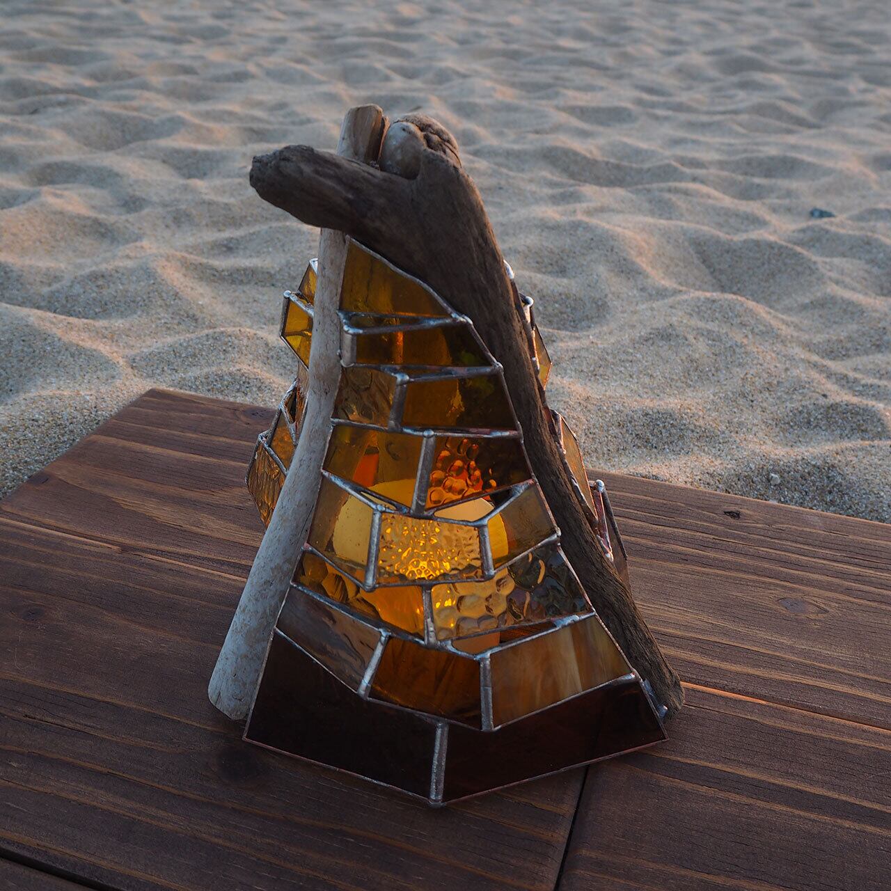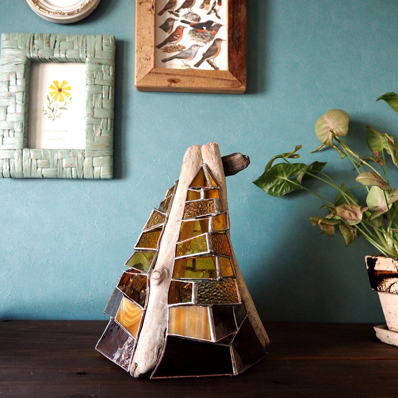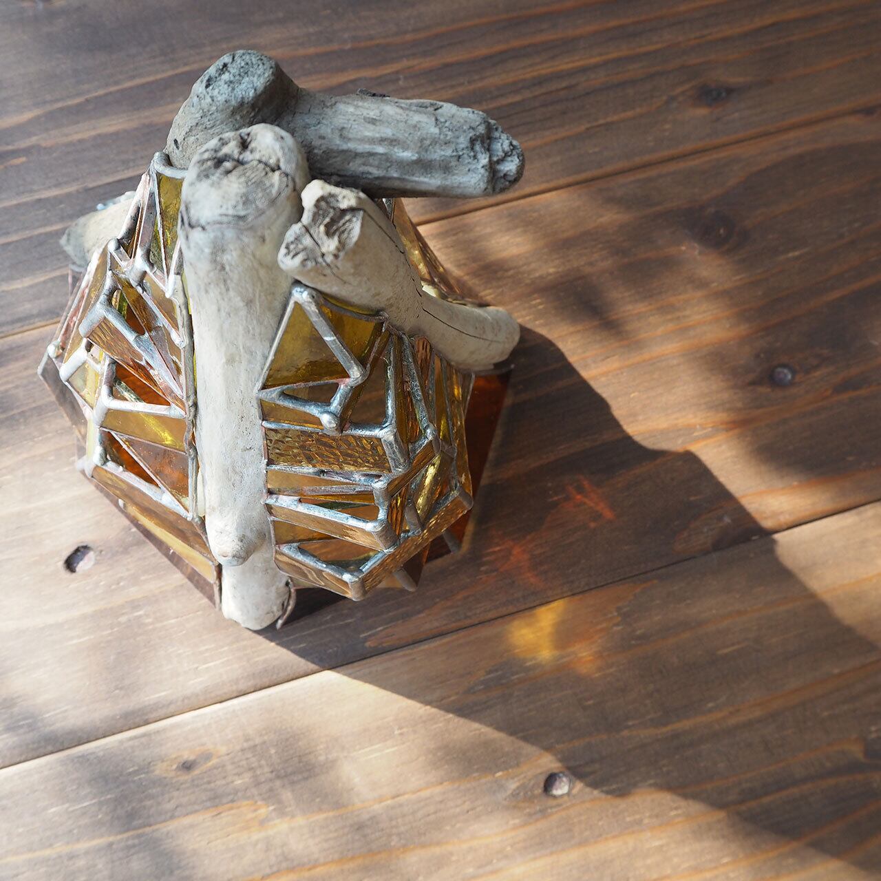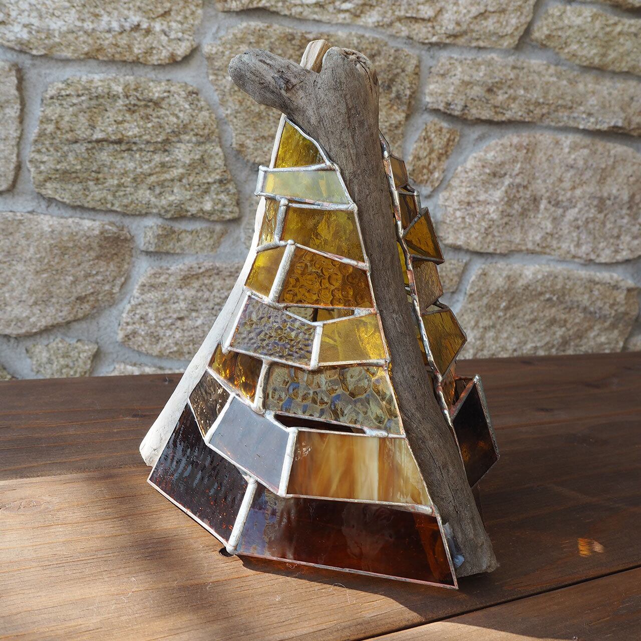 流木の自然な流線形に合わせて、ステンドグラスを立体的に組み上げた世界でただ一つのアートオブジェ”TOWER”。
